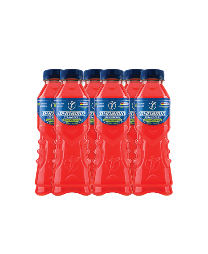 حجم هر بطری 500 میلیلیتر نوشیدنی داینامین توتفرنگی در باکس 6 عددی