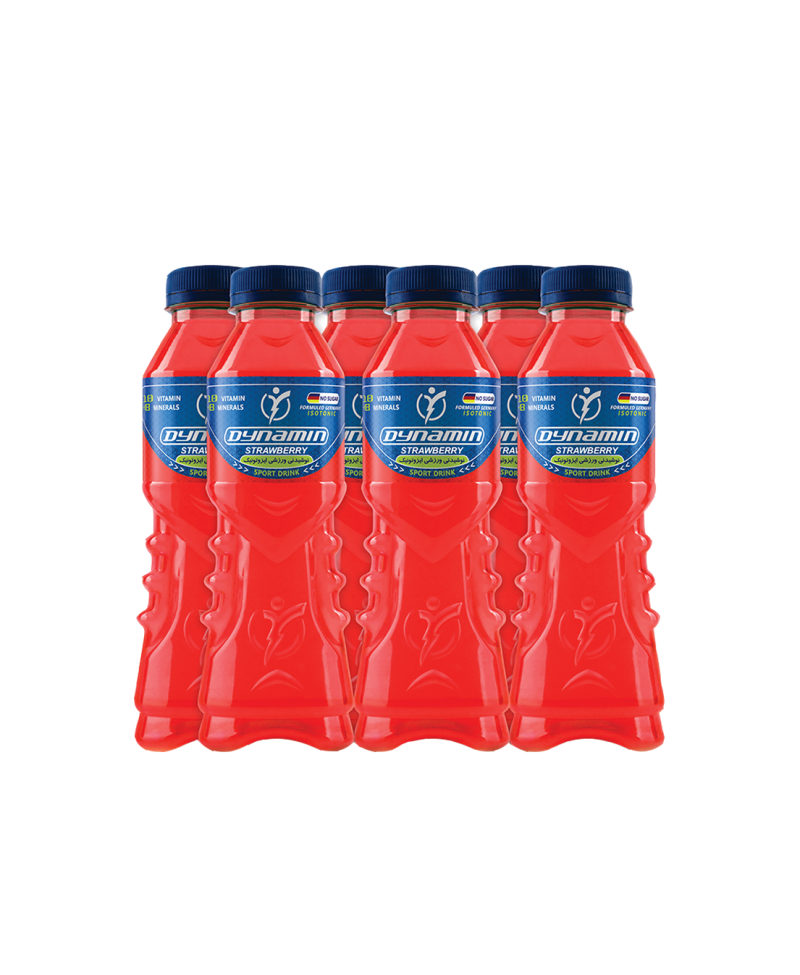 حجم هر بطری 500 میلیلیتر نوشیدنی داینامین توتفرنگی در باکس 6 عددی